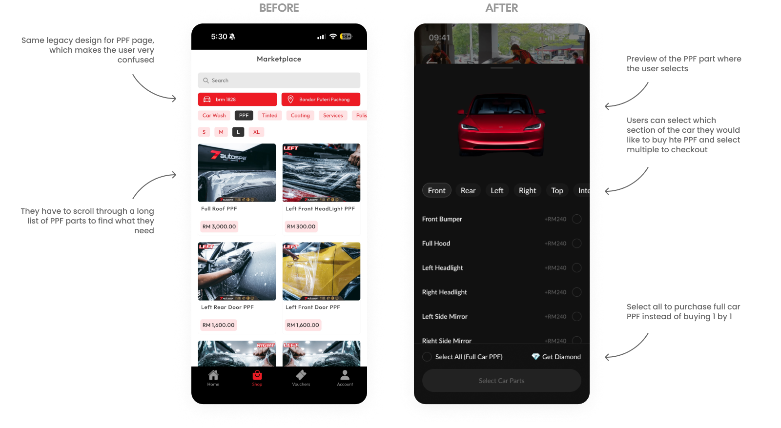 The PPF booking page was redesigned to replace a confusing legacy list with a highly visual, interactive selection interface. To eliminate the need to scroll through long lists of individual parts, we introduced a 3D-style car preview that dynamically updates as users select specific sections for protection. This new flow allows users to multi-select various car segments for a custom checkout or use a single "Select All" toggle to purchase a full-car PPF package instantly, significantly streamlining the decision-making process.
