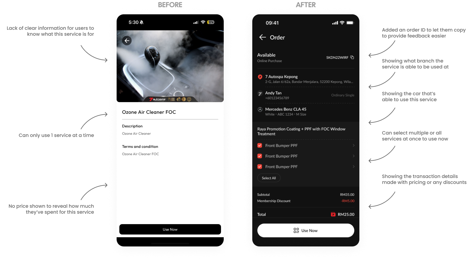The redesigned services page transforms a vague interface into a comprehensive command center. We added an Order ID, branch location, and vehicle details to improve transparency and support. Most significantly, the update replaces the one-at-a-time restriction with a multi-select system for simultaneous service redemption, complete with a clear pricing and discount breakdown.