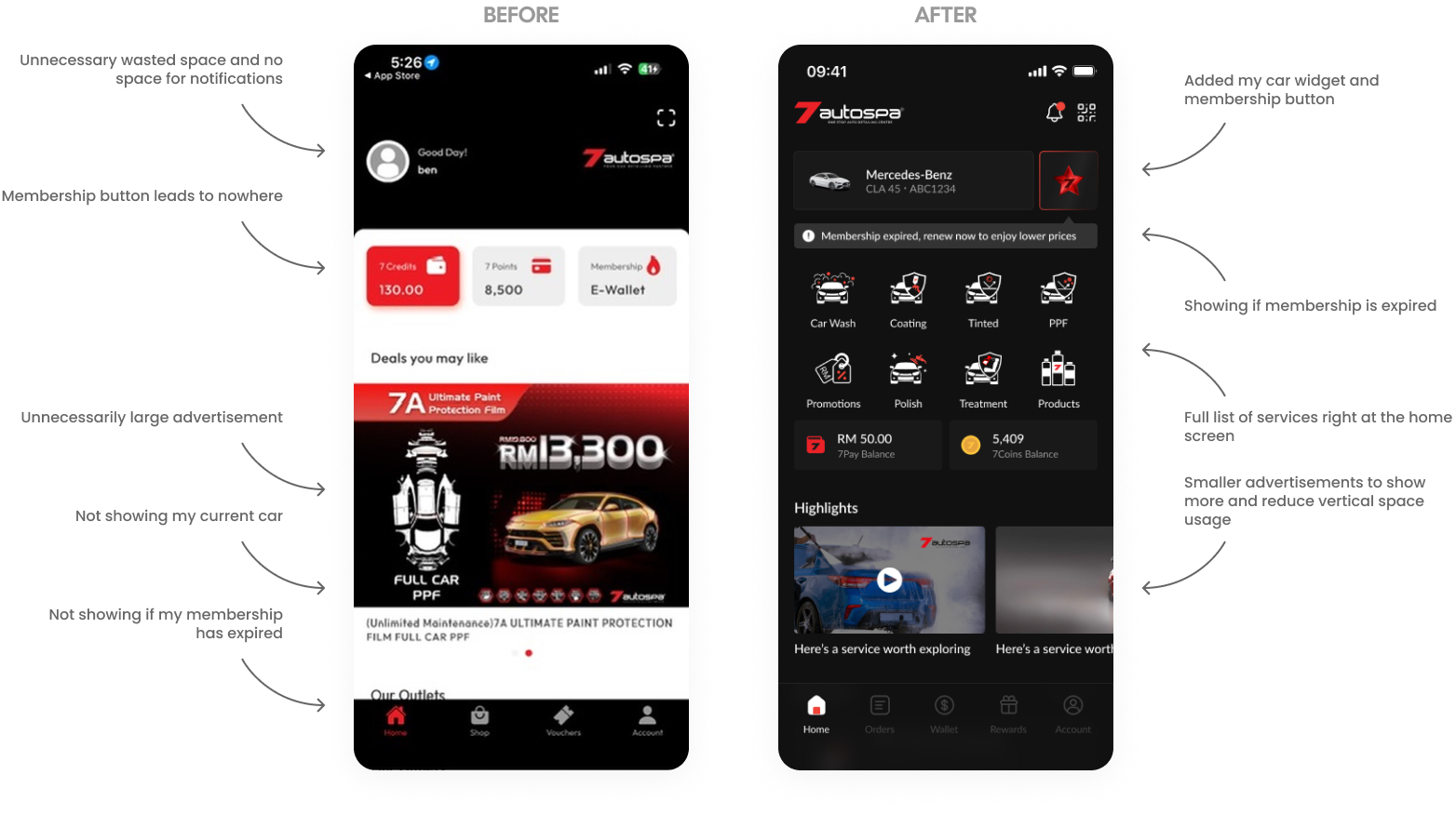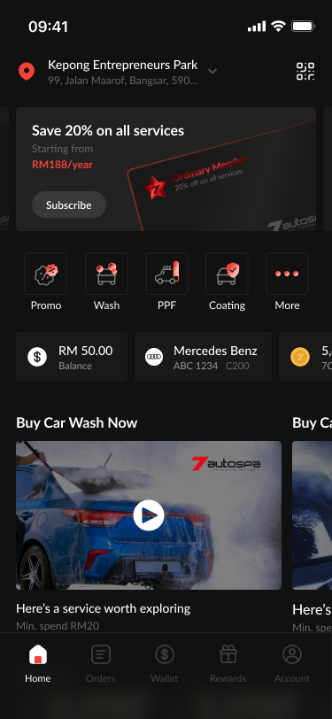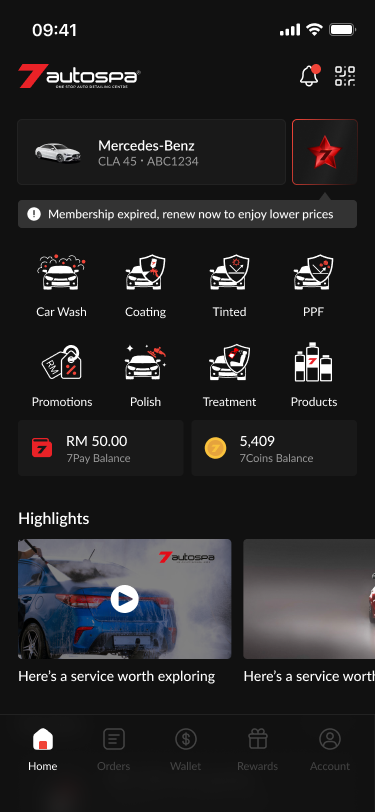 The 7Autospa home page was redesigned from a basic utility list into a premium, personalized dashboard that reflects the brand's high-end identity. We optimized the layout by reclaiming wasted header space for notifications, replacing oversized ads with a streamlined service icon grid, and introducing a "My Car" widget for a tailored user experience. Crucially, the update resolves previous navigation dead-ends by integrating a dynamic membership status bar and services list, ensuring a frictionless and high-personality journey for every customer.