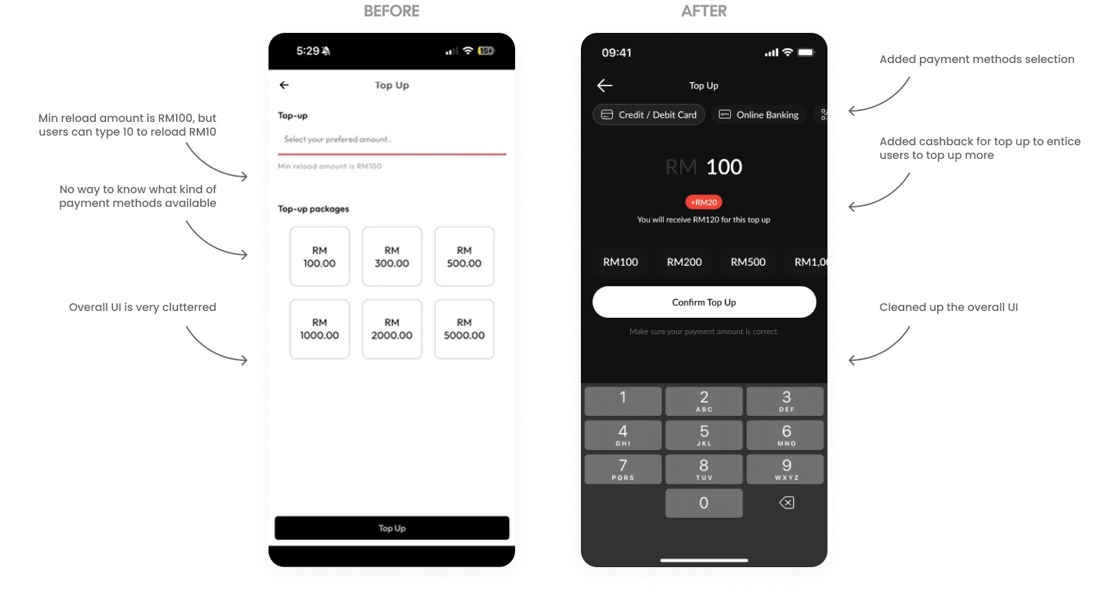 The Top Up page redesign replaces a cluttered, confusing layout with a focused UI that prioritizes speed and user incentives. We introduced visible payment method selections and a dynamic cashback indicator to encourage higher transaction values. By streamlining the amount selection and clarifying reload requirements, the new interface eliminates friction and delivers a more modern, intuitive payment experience.