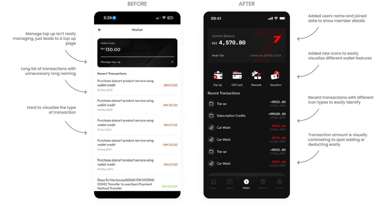 The Wallet page was redesigned to transform a text-heavy transaction list into a high-utility financial dashboard. We replaced the vague "Manage Top-up" link with a branded digital card featuring member details and introduced a dedicated icon row for quick access to Top Up, Gift Cards, and Rewards. To enhance scannability, we streamlined transaction names, added identifying icons, and used high-contrast colors to differentiate credits from deductions at a glance.