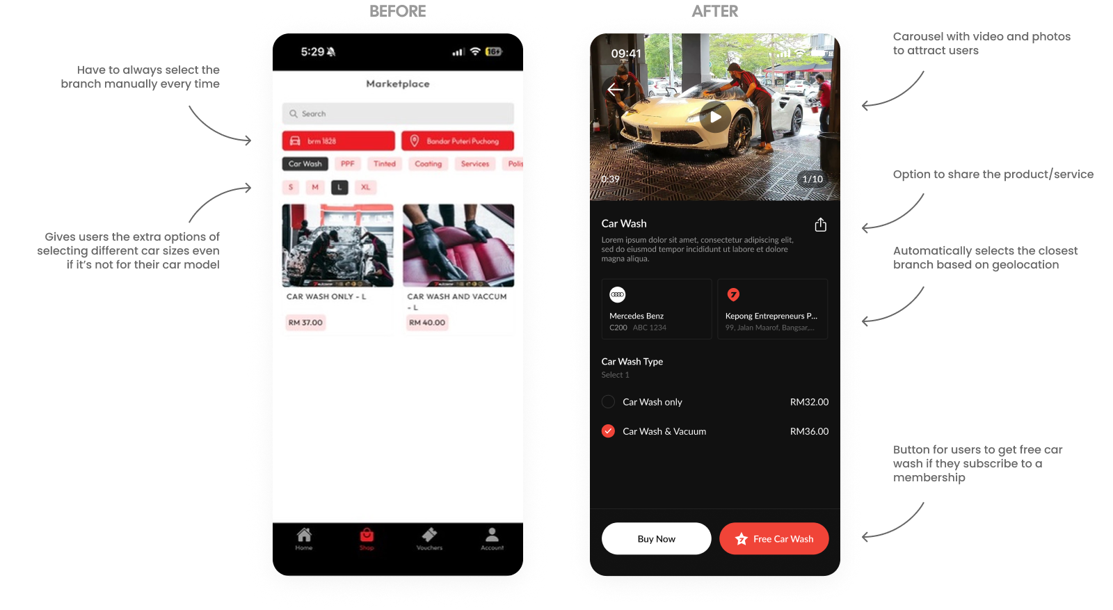 The car wash booking flow was redesigned to replace a manual, high-friction process with an automated and visually immersive experience. We implemented a video carousel for better service visualization and geolocation to automatically select the nearest branch. By syncing with the user's pre-registered vehicle to remove redundant size selections and adding a "Free Car Wash" incentive, the new flow significantly reduces friction while driving membership conversions.
