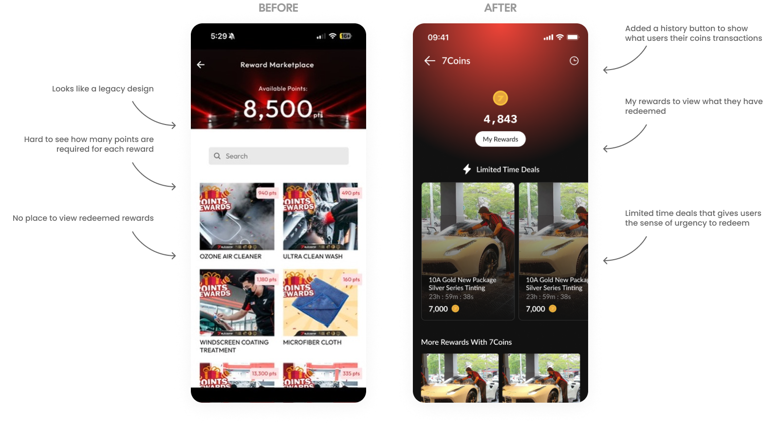The 7Coins Rewards page was modernized to replace a legacy aesthetic with a more urgent, user-centric interface. We introduced a dedicated history button for point tracking and a "My Rewards" section to allow users to easily view their redeemed items. To improve motivation, the redesign features prominent "Limited Time Deals" that create a sense of urgency, along with much clearer point requirements for each reward compared to the previous cluttered view.
